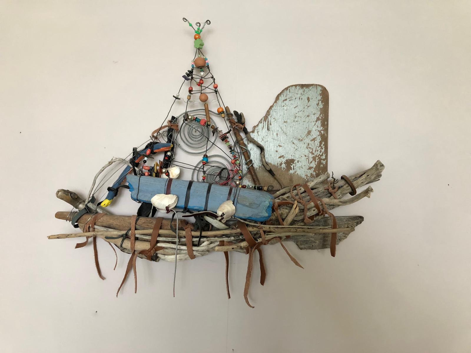 “For the last ten years I have been exploring/creating mixed media wall hangings and sculptures using found objects from land and sea.