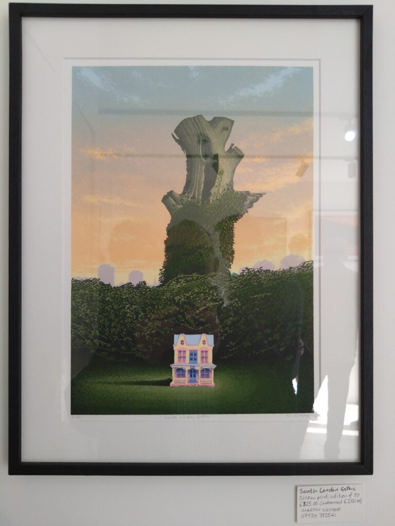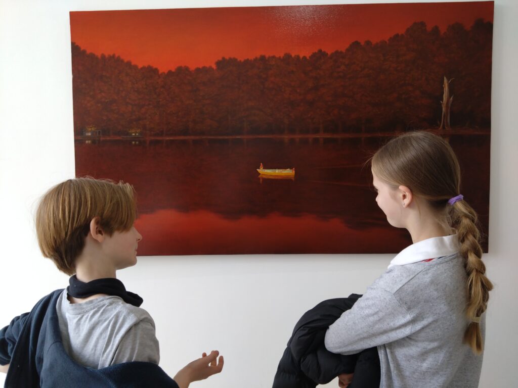 One such artwork was his ‘On the Way to a Better Place’, a large acrylic on canvas piece, that shows two children in a small boat gliding along a wide river that is seemingly lit by a fiery sunset. It is one of the ‘imagined’ landscapes in the exhibition’s title and is based on the book, The Night of the Hunter, that Martin has recently read, which was made into an American Gothic film starring Robert Mitchum as a serial-killer preacher. The painting shows the children trying to escape the murderous churchman, who won’t be far behind, but you would never know that just from looking. Although after we spoke, I did try to find Mitchum hiding in the forest… The Gothic theme crops up elsewhere in Martin’s art in the show.