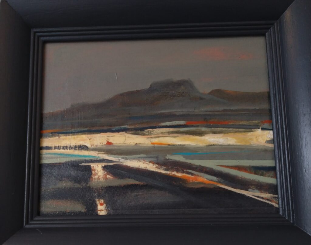 Of the current exhibition, where he is showing oil paintings on board and canvas, and several mixed media artworks. He explained the mixed media works that combined oil and newspaper text as leaving layers of information. They did add something else when you viewed them, a little je ne sais quoi when half-words appeared from beneath the brushstrokes and piqued the interest.