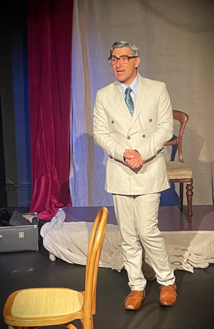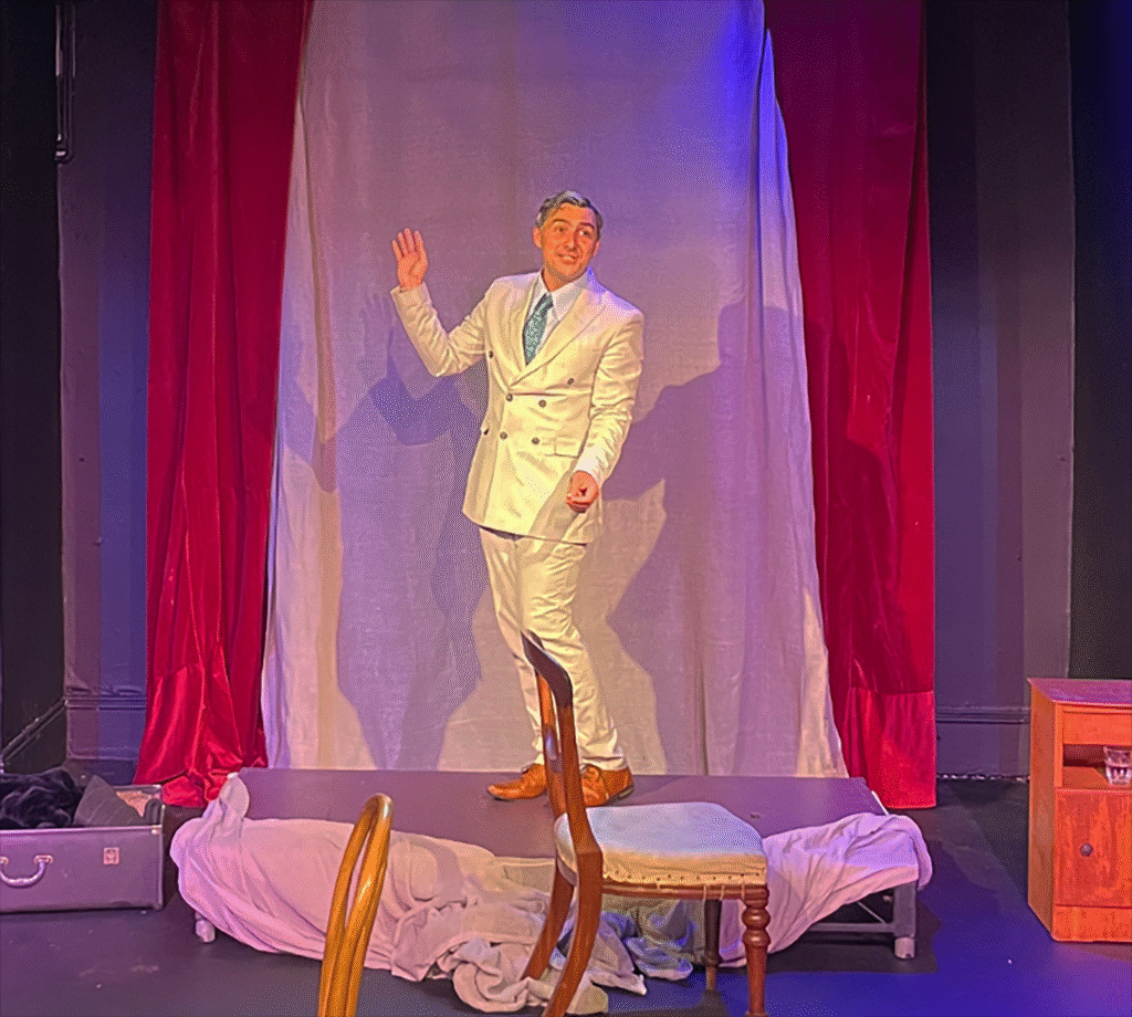 The audience filed in. The set furniture was covered in white sheets. As the lights went down a spotlight hit the sheets and a face emerged from within; it was Madame Blower, a charlatan clairvoyant connecting the gullible with the dead who she said were sending messages from beyond. I thought I’d come on the wrong night as I was expecting a biog of Larry Grayson, writes Michael Holland.