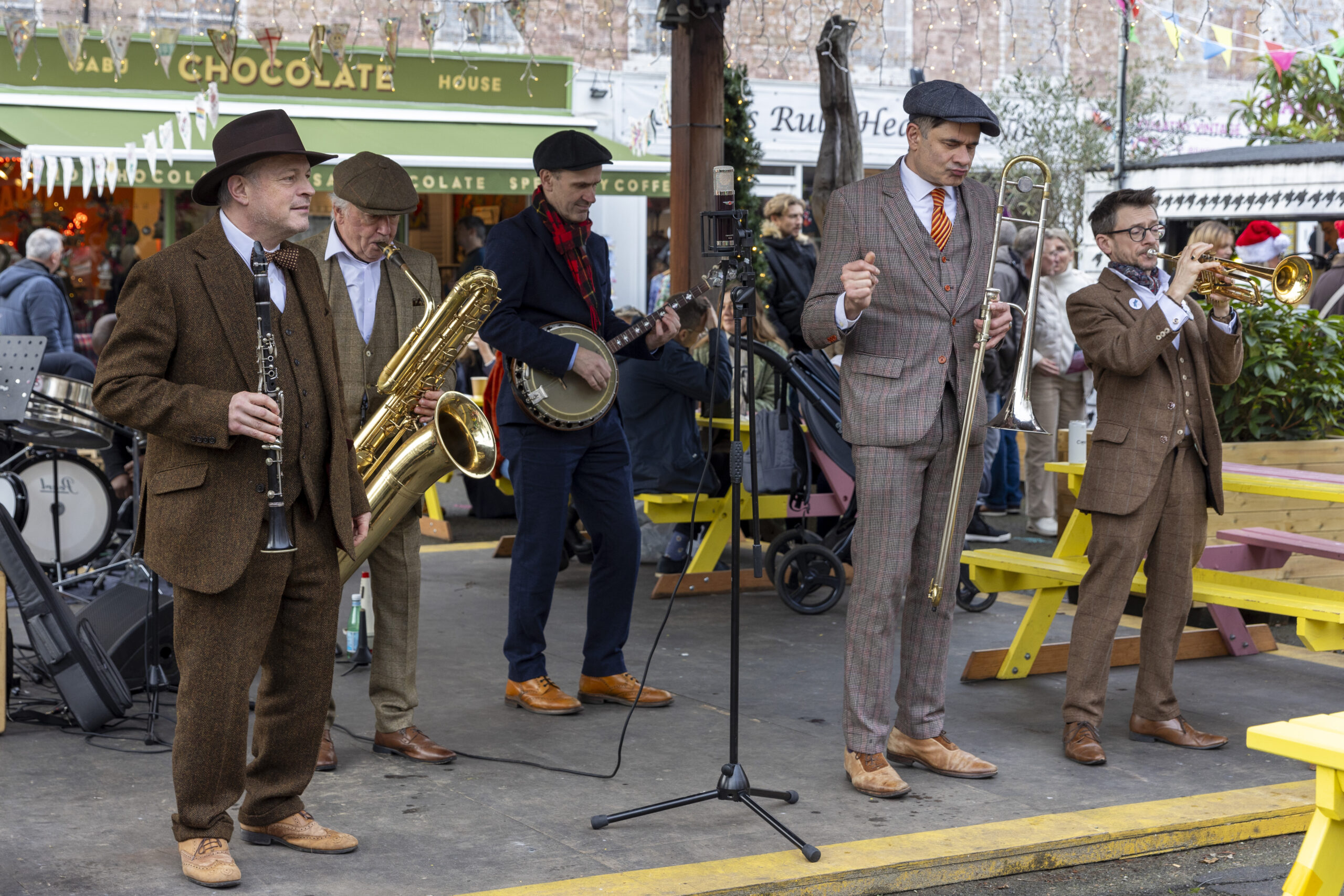 Enjoy the infectious jazz energy of Doolally Tap performing festive standards before teaming up with the Donoghue Quartet for classic carols. The Marcus Penrose Quartet brings holiday favourites to life, while our DJ keeps the vibe going with holiday hits between sets. Warm up your vocal cords and join the singalong under twinkling lights.