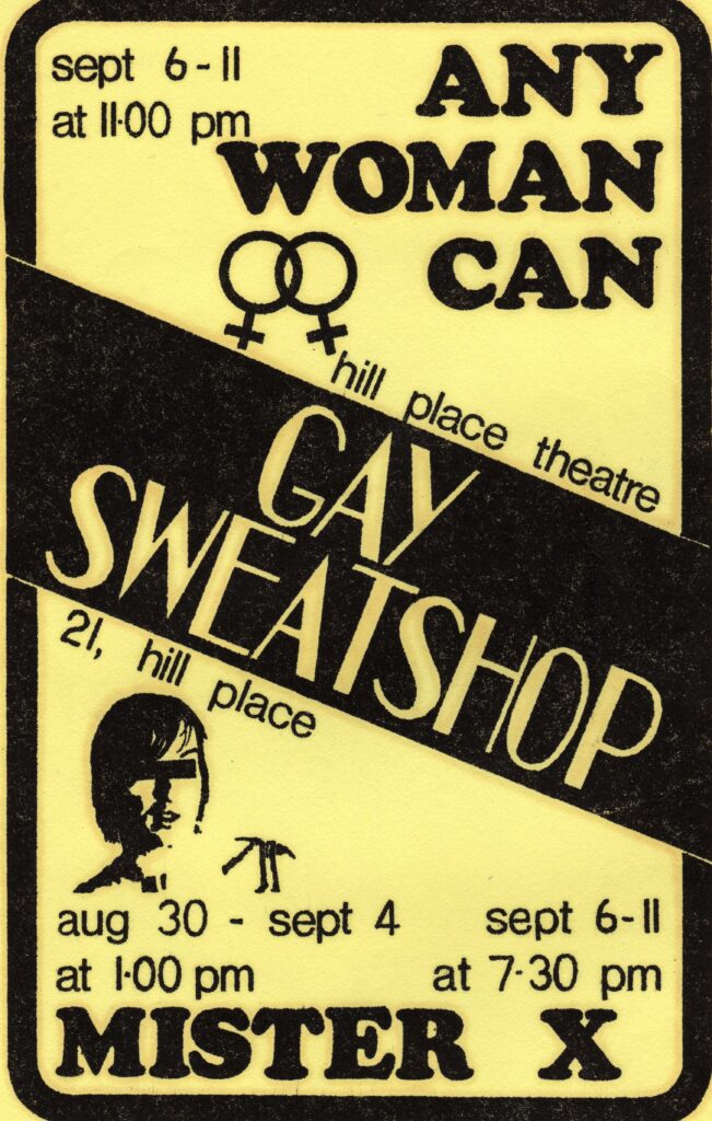 Dr Susan Croft says: “50 years ago Ed Berman, founder of influential arts project Inter-Action agreed to host Britain’s first Gay theatre season at the Almost Free Theatre in Soho. The press came in droves because as Alan Wakeman, one of the producers and a founder of Gay Sweatshop said: ‘We were saying, ‘Yeah, we’re gay – so what? and having the audacity to put on plays about what life is like for gay people’. Runs were extended, moving to the Duke of Argyll pub and then the ICA and that first season was all plays by men but in 1976, Gay Sweatshop staged Jill Posener’s Any Woman Can, and toured this nationally. Julie Parker, who acted in it says: ‘People would come up …and talk to you afterwards… in tears… and say, ‘That’s me, that’s my story, that’s my life,’ and ‘I’ve never met people like you before.’ This exhibition celebrates that early history along with lesser-known stories such as that of Bradford-based company The General Will who in 1975, controversially re-formed from an agit-prop group to a primarily working class lesbian and gay theatre company, making work with a wide range of community groups. Meanwhile In South London, the inhabitants of gay squats in Railton Road, Brixton were setting up their own activist theatre group the Brixton Faeries, Bloolips were performing in Notting Hill and numerous other lesbian and gay theatre groups such as Hormone Imbalance, Character Ladies, and Consenting Adults in Public were forming .