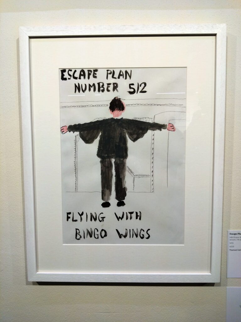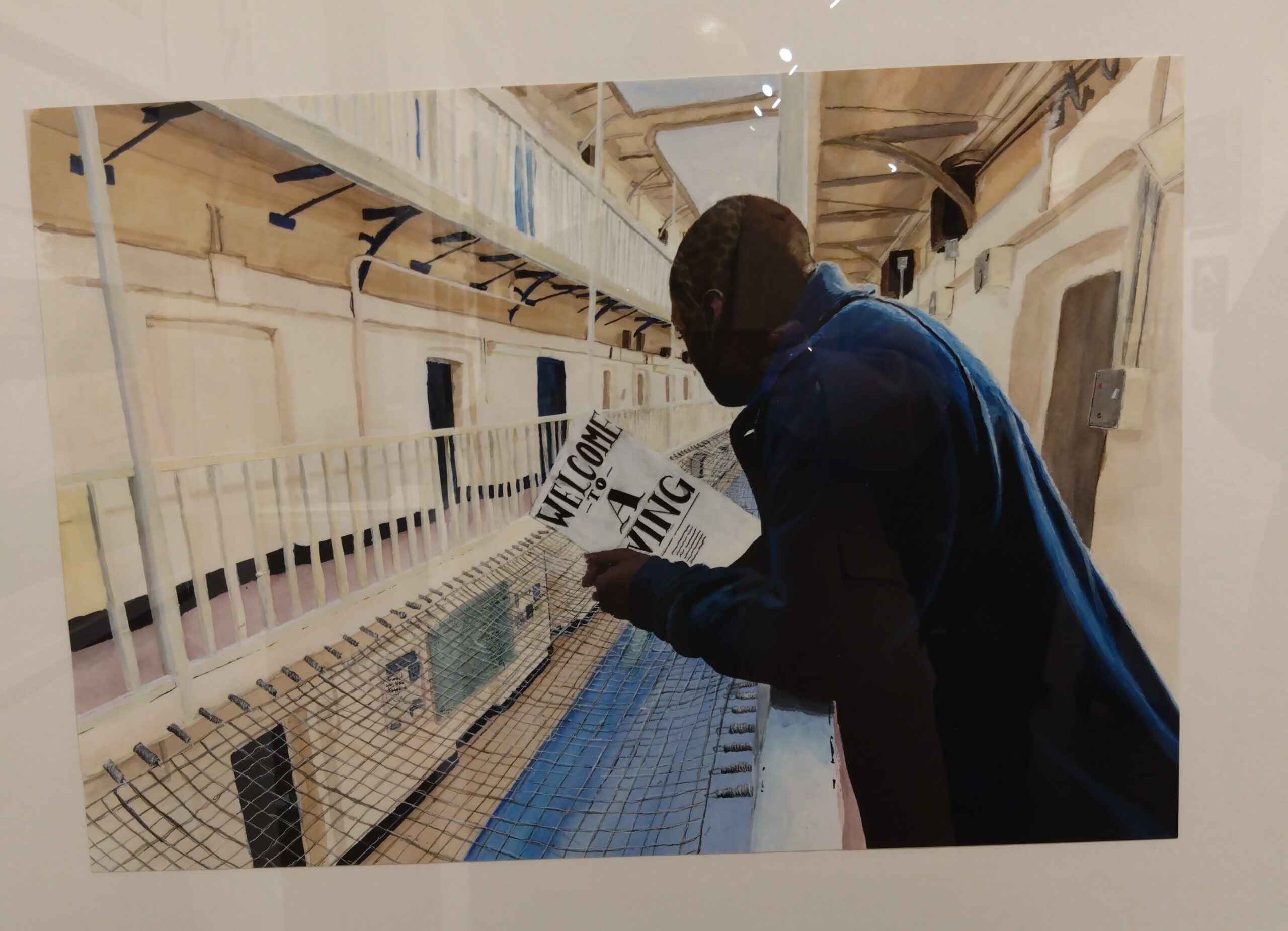 My favourite, though, was Welcome to A Wing, Wing, a simple composition, almost devoid of colour, a man in silhouette arriving on the landing, an empty, soulless place that offered no warm welcome. He holds a piece of paper, seemingly with the rules to abide by during his time there.