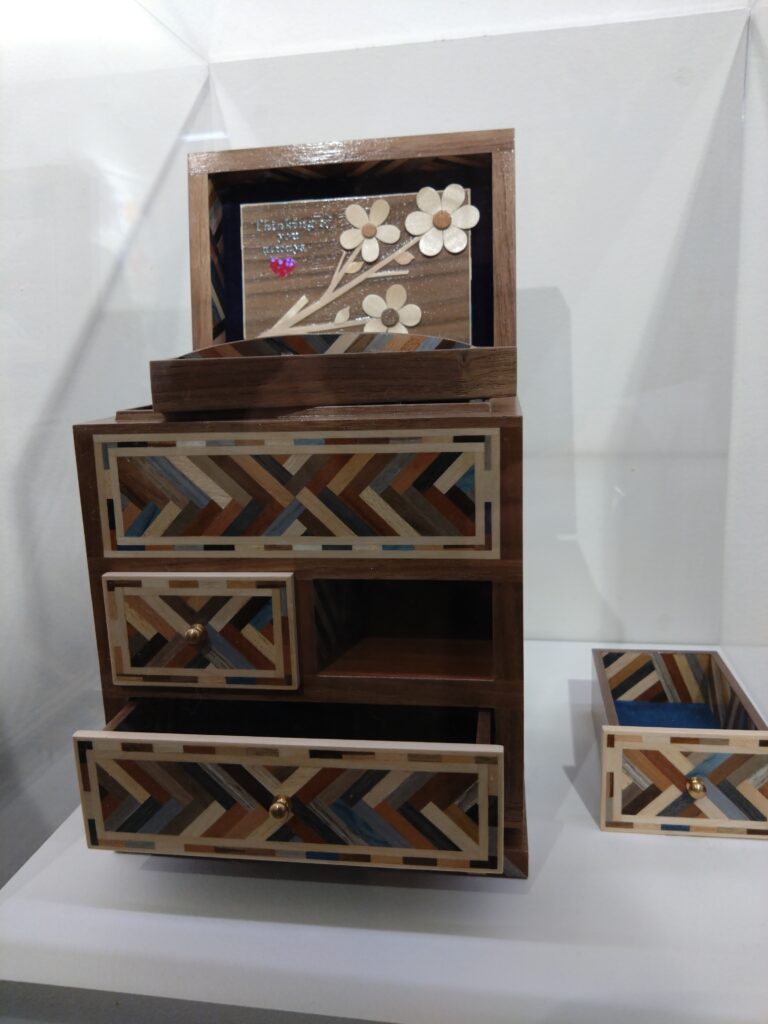 With money and materials lacking in jail it was good to see many 3D works made from found or recycled objects. One enterprising artist from HMP Wymott used cell furniture smashed up by angry prisoners to make beautiful trinket boxes. They deservedly got a Gold Award for Woodcraft. There was a bag made from can ring-pulls, a pirate ship in full sail built from all the flotsam and jetsam found on any prison wing.