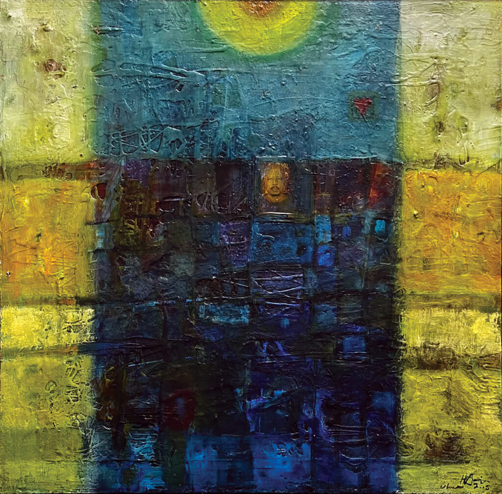 Hassan Ali Ahmed’s haunting Homage to Hussein Sherrief explores the artist’s Nubian roots with a tiny face floating against brilliant blue, yellow and ochre colours of the Nile.