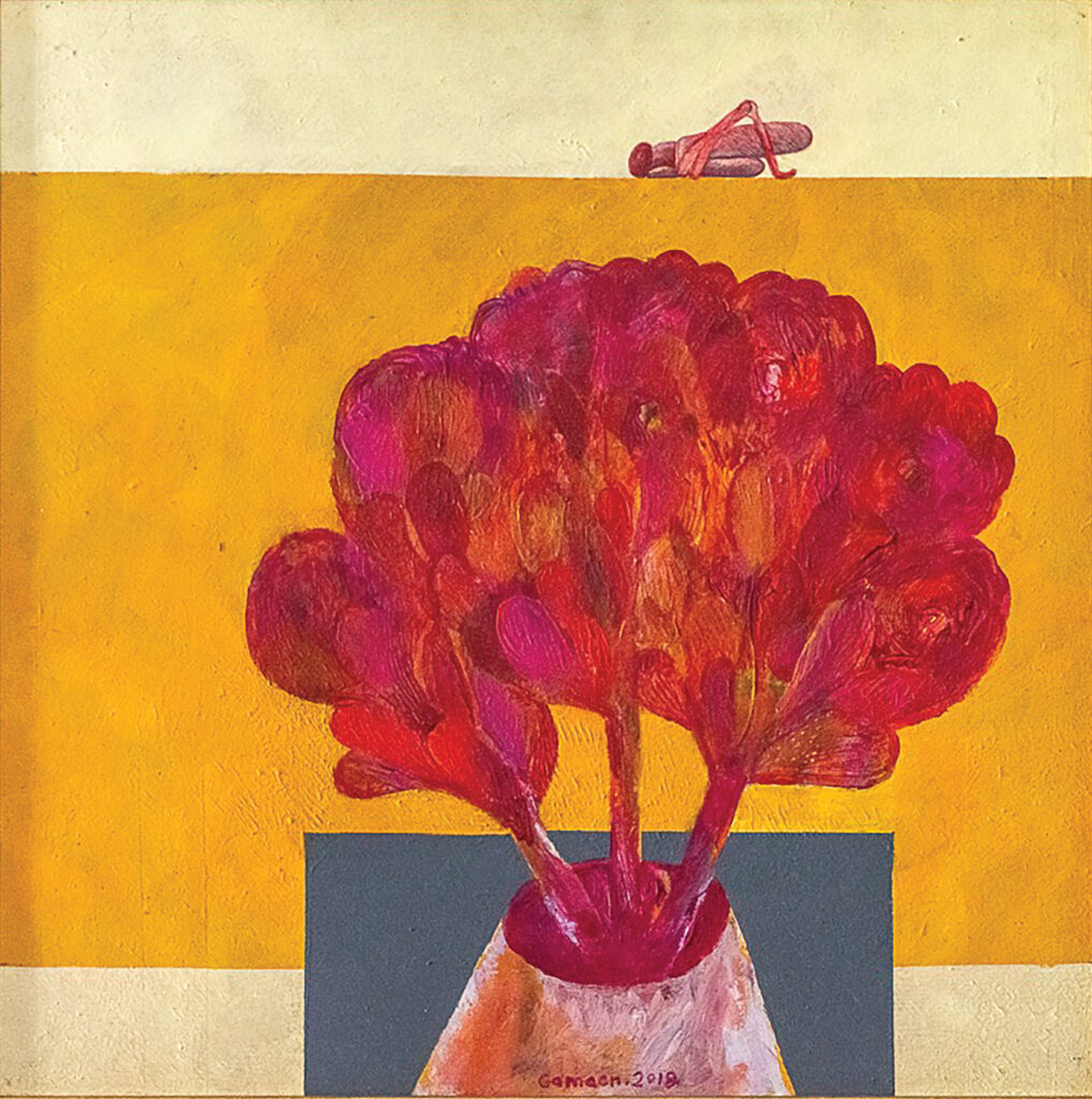 Hussein Gamaan’s intense magenta flowers in a vase against a burning yellow backdrop, with a locust crouched at the top, show a use of colour just as daring as Matisse.