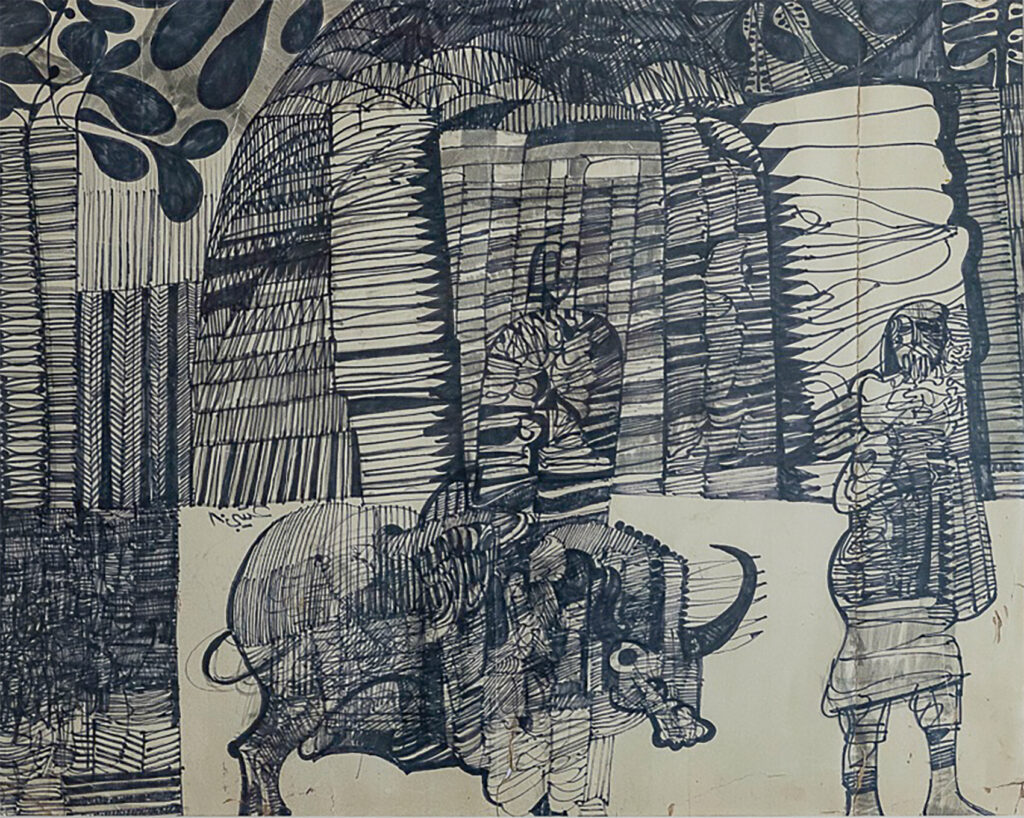 Other striking images include Mohamed Abdella Otaybi’s ink on paper of a bull and two figures against a stylised geometric pattern depicting a tree and hut.