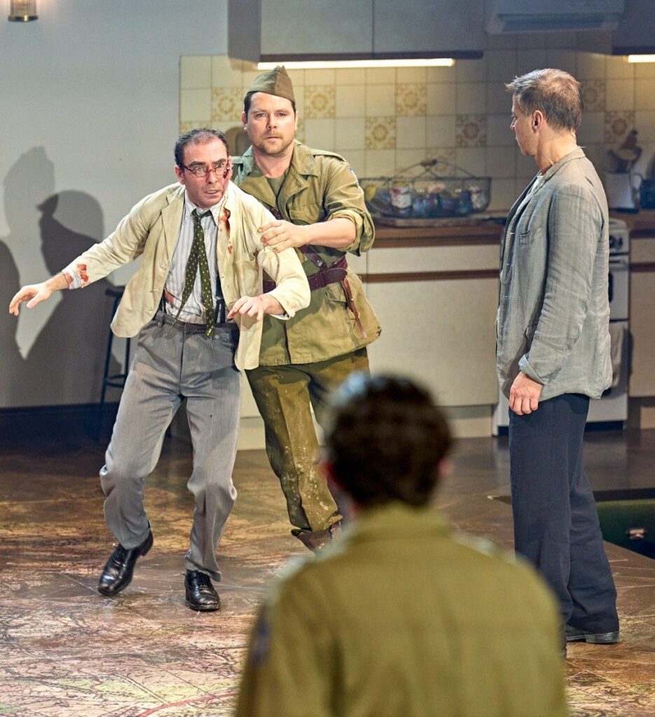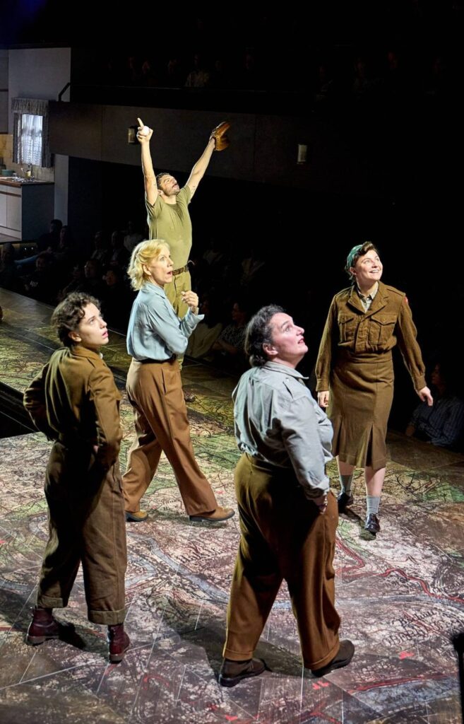 All of these performances are facilitated by Miriam Beuther’s powerfully suggestive set design in the Dorfman Theatre. On stage, we find the cosy trappings of domestic order – a kitchen, drawing room, piano, bookshelves. Beyond the kitchen, lurks the wild and unmasterable Bavarian woods. Beneath the floorboards, lie confidential war files – the conspiracies and secrets on which lives were tentatively rebuilt after the war. Together, Lan and Beuther stage history not as backdrop but as sediment: layered, unstable, and prone to fissure.