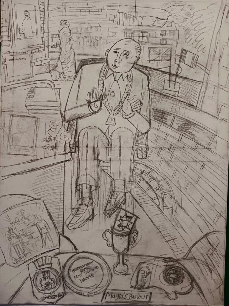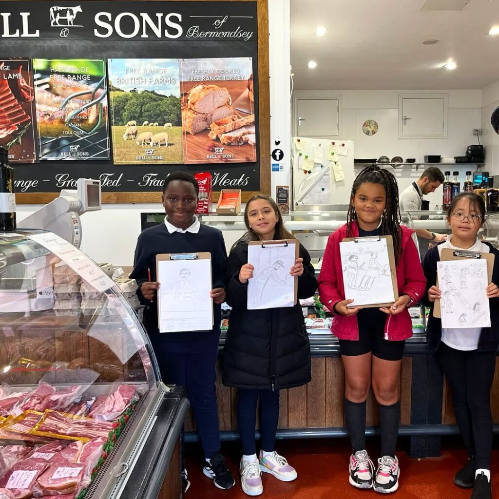 Artist, Ed Gray, has just completed a term collaborating with Year 5 students at Boutcher Primary School on an extensive art project, one that highlights the world of work in Southwark and includes, butchers, a fishmonger, a mechanic, a florist, a blacksmith, a combat trainer, a Pilates teacher, a brewery, a barrister, a Bishop, foodbank volunteers, fashion designer, artist, chefs, dentists, a fire crew, a local startup and the man who opens and shuts Tower Bridge, writes Michael Holland.