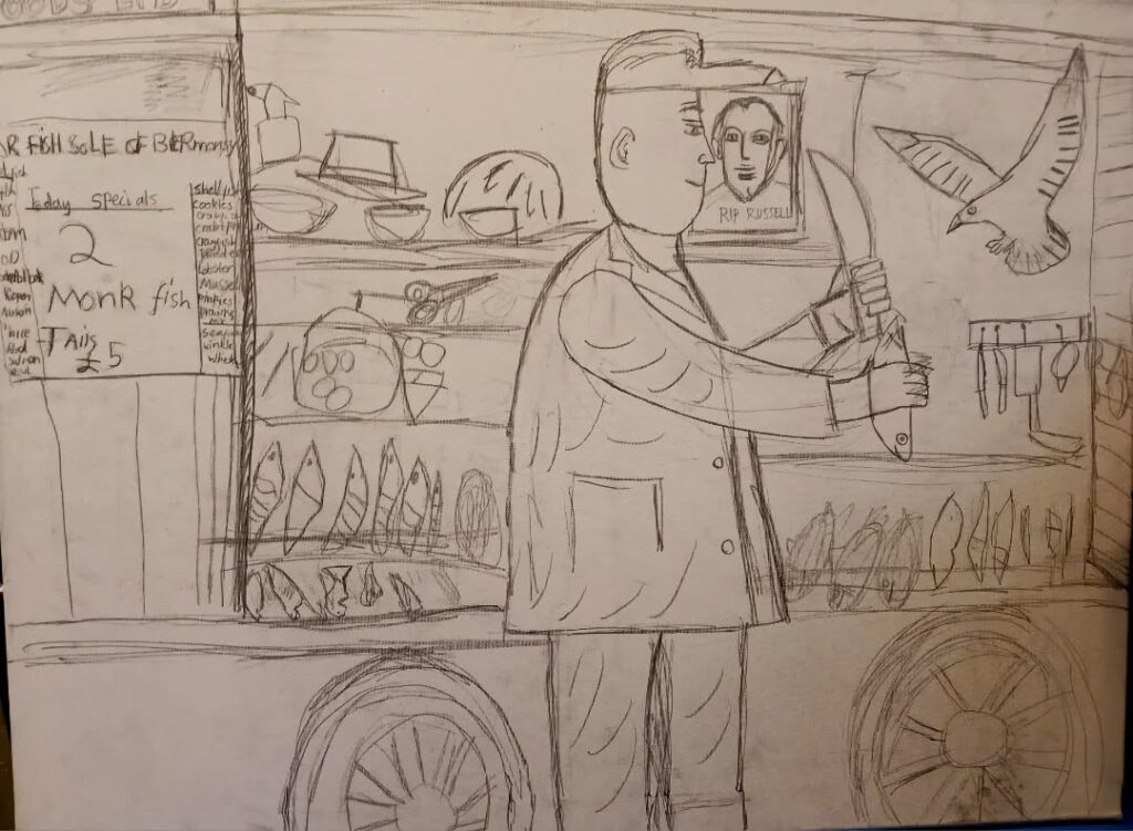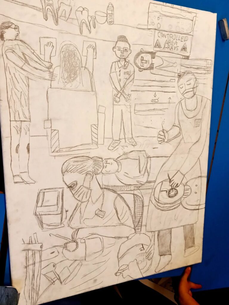 Ed Gray’s aim, he says, ‘was to create a project that introduced pupils to the world of work and gave our chosen subjects the chance to discuss their working lives in a relaxed atmosphere whilst being sketched by the pupils. The pupils witnessed the routines of working life first-hand and listened and asked questions of our hosts as they sketched.