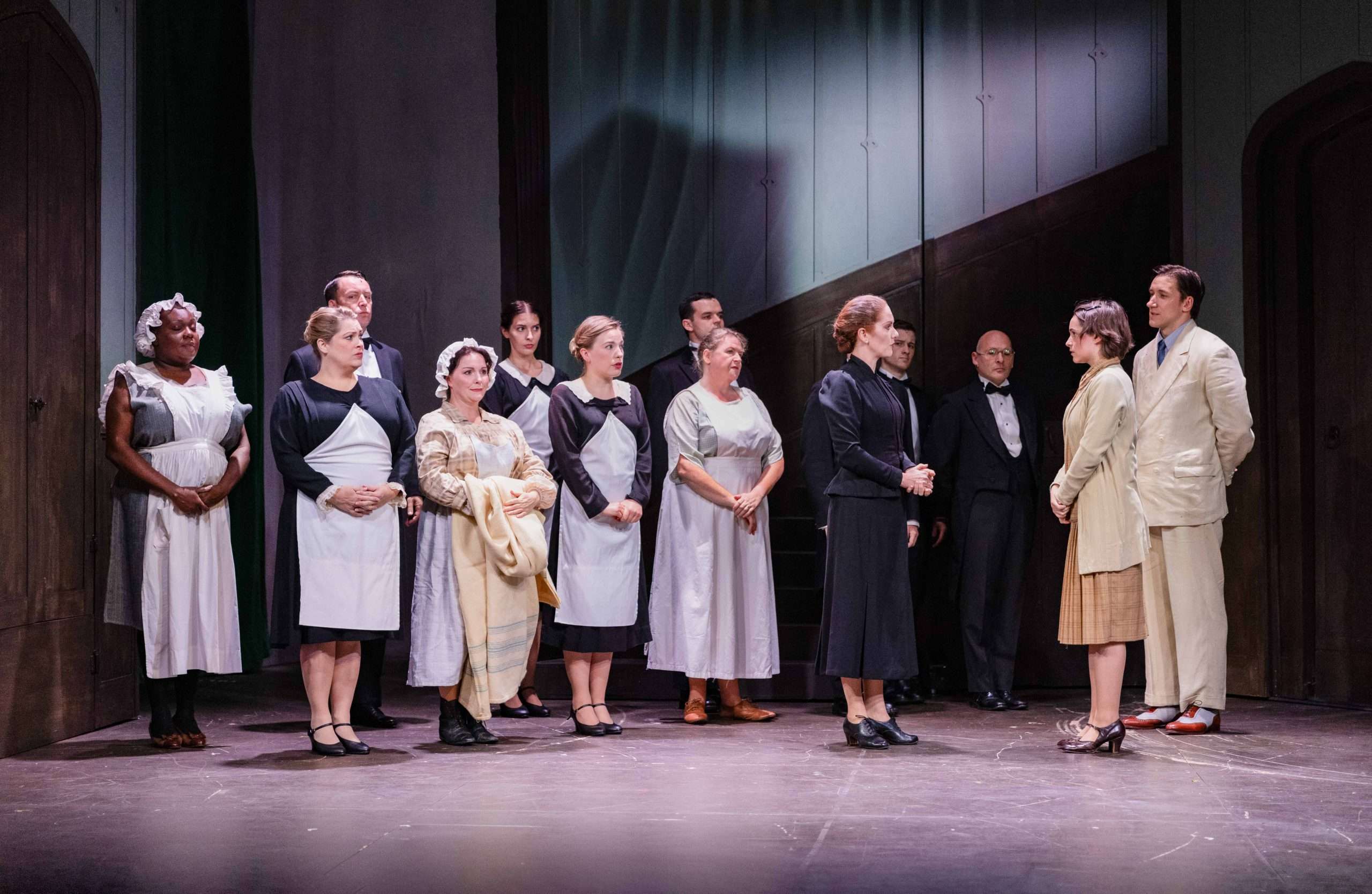 The youthful and naive heroine (played by Lauren Jones), whose name we never encounter, meets Maxim de Winter (Richard Carson) in Monte Carlo and is swept away by his charm. A charm that perhaps grows on you? I must admit their romance didn’t entice me right away. I felt the passion in their singing voices, yet the heroine’s initial awkwardness and Maxim’s bluntness did not convince me of a great love.