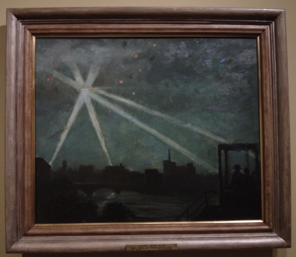 There is a short introductory video that opens with a shot of Tower Bridge, one of the main targets for the Luftwaffe, along with St Paul’s Cathedral and the Houses of Parliament, for their iconic status. The artworks follow on, set in sombre lighting, intermittently accompanied by oral and written testimony.