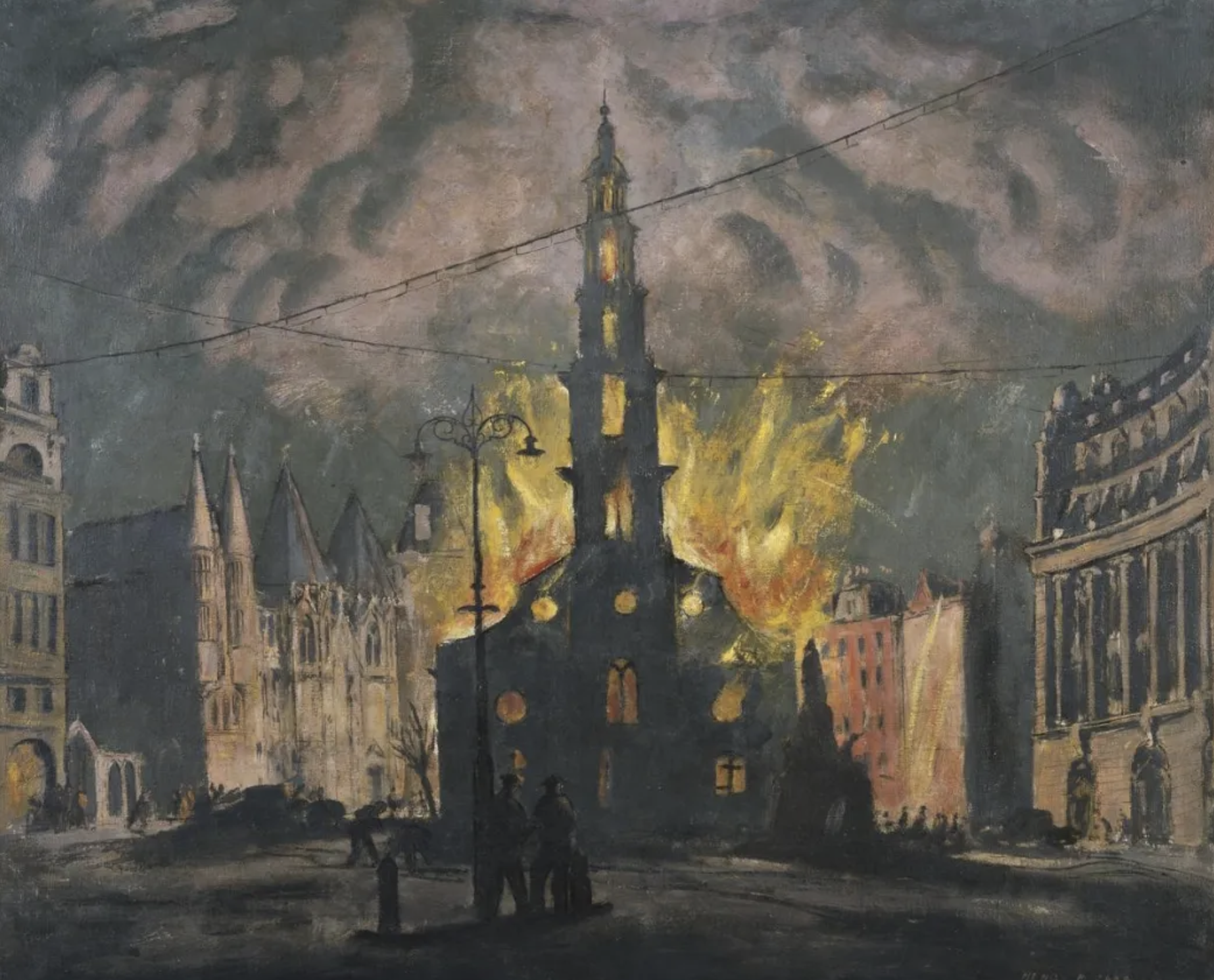 There are artworks that show the conflagration, and the brave workers who fought the fires through the night; the locals huddling in cellars and underground stations, and the attempts to keep morale up with makeshift entertainment, before daylight returned and blinking eyes emerged to see the devastation and ruin, never knowing if there was a home to return to. Hospital staff constantly on call are consigned to canvas for all time.