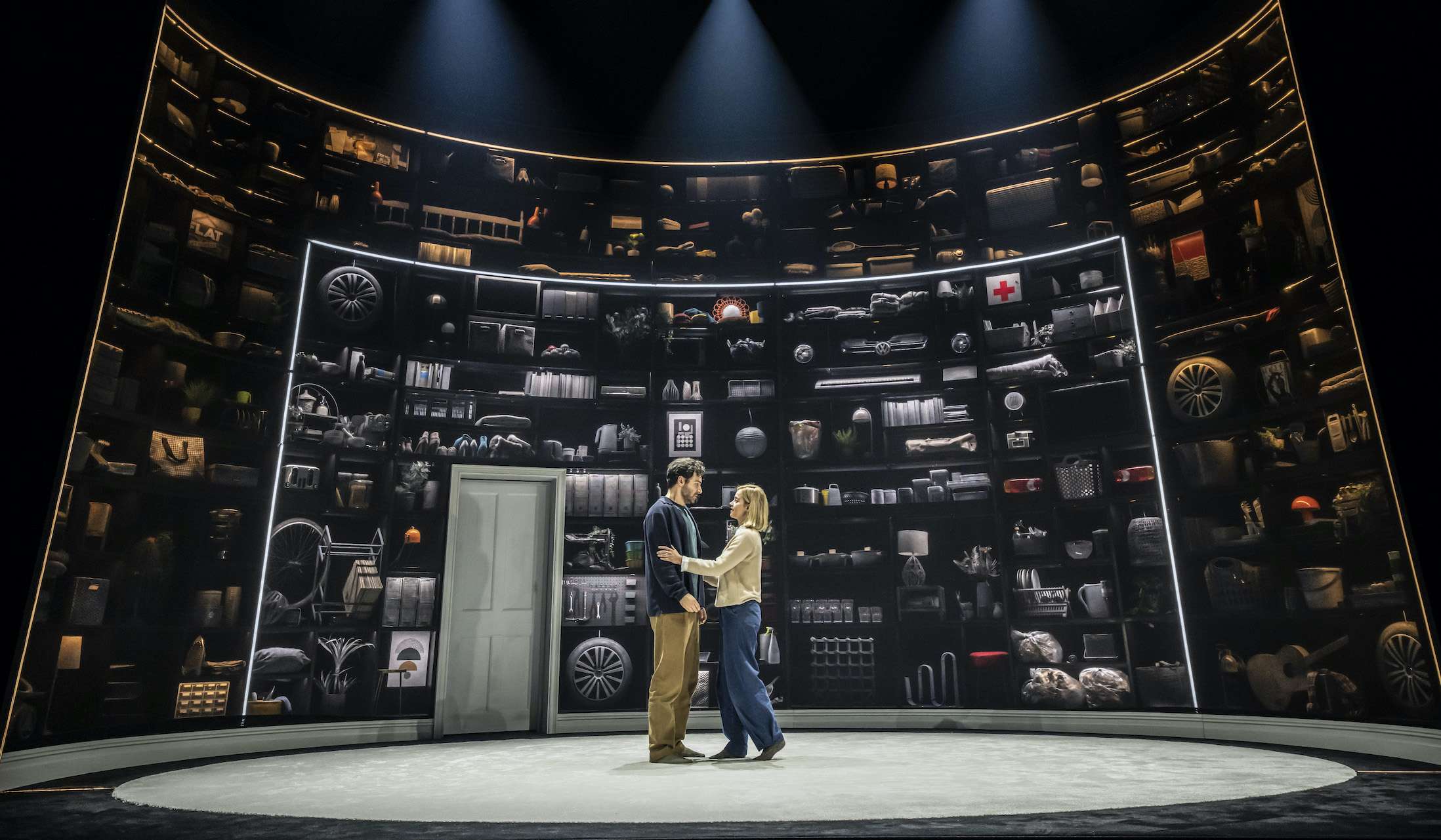 Surrounded by a compartmentalised set of their life and accumulated belongings, everything organised and tidy, Bernadette (Jenna Coleman) and Oliver (Aidan Turner) are given to us in short scenes, some less than a minute, bursts of energy where the wheat of words is separated from the chaff of chatter, leaving us with just the bare essentials of communication.