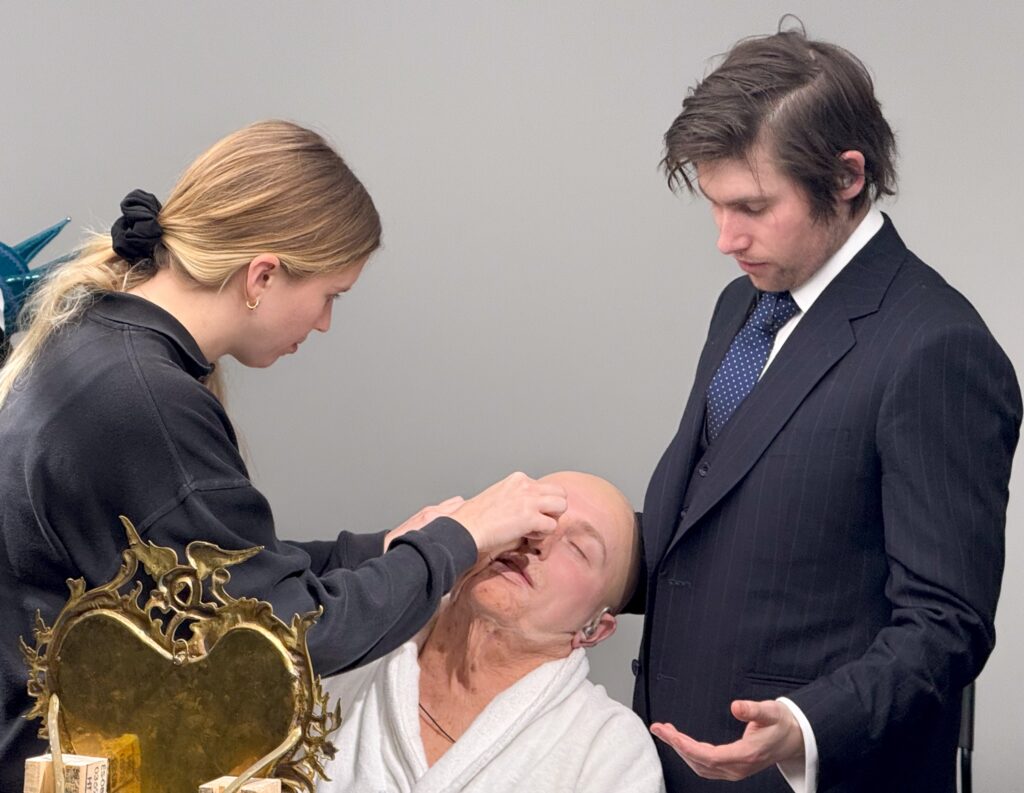 Important for the play is how Clark has worked with the two actors, in particular, recreating the trope of ‘the gay boy dressing up with his mother’s wardrobe’. The characters’ names ‘Exeter’ (Lewis Blomfield) and ‘Essex’ (Benedict Wishart), are a nod to Shakespearean times, and Hitchcock, a strong inspiration for Clark. The Prosthetics Makeup Artist is Aurora Beadle.
