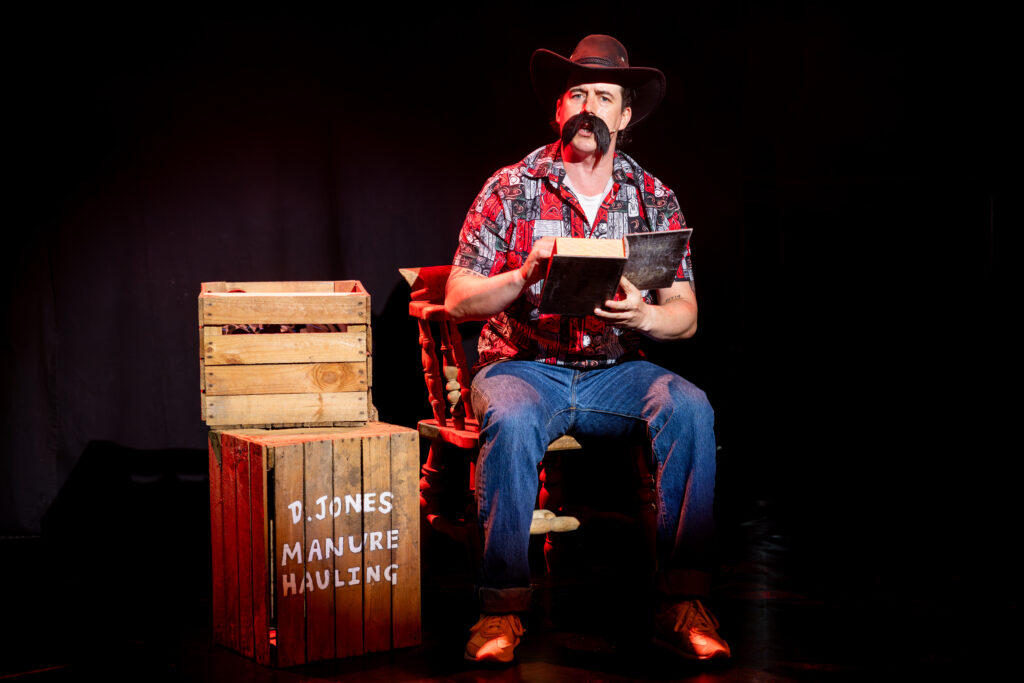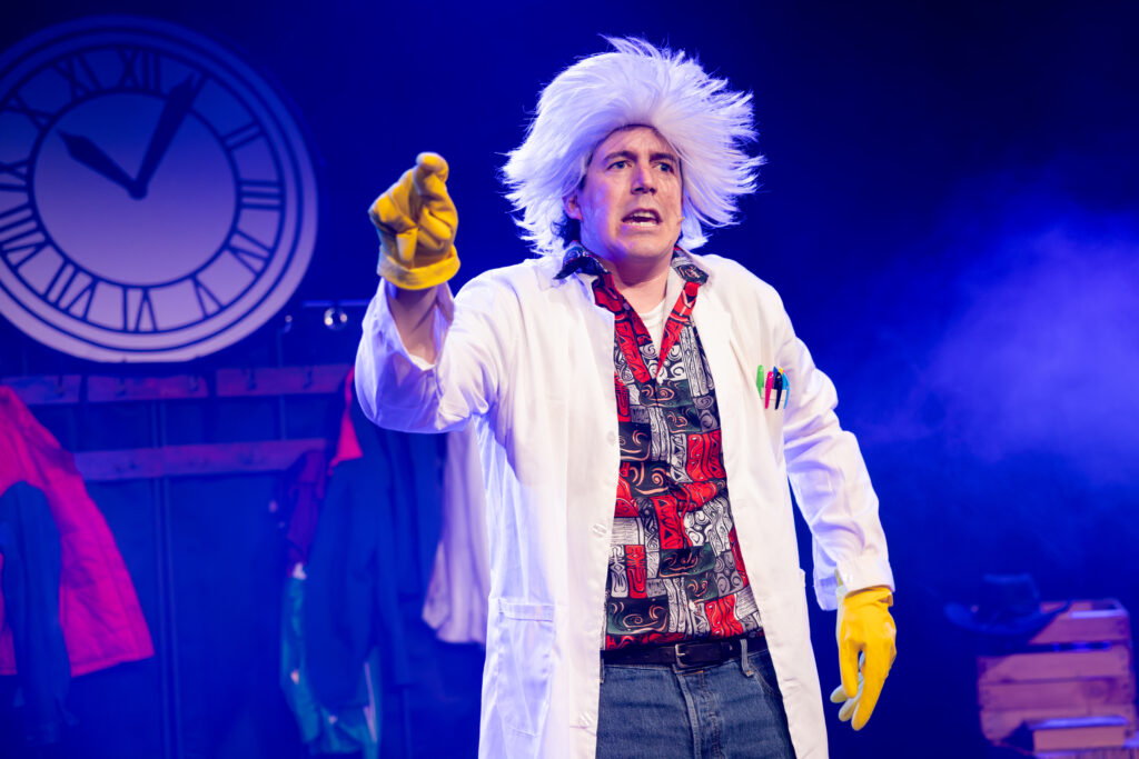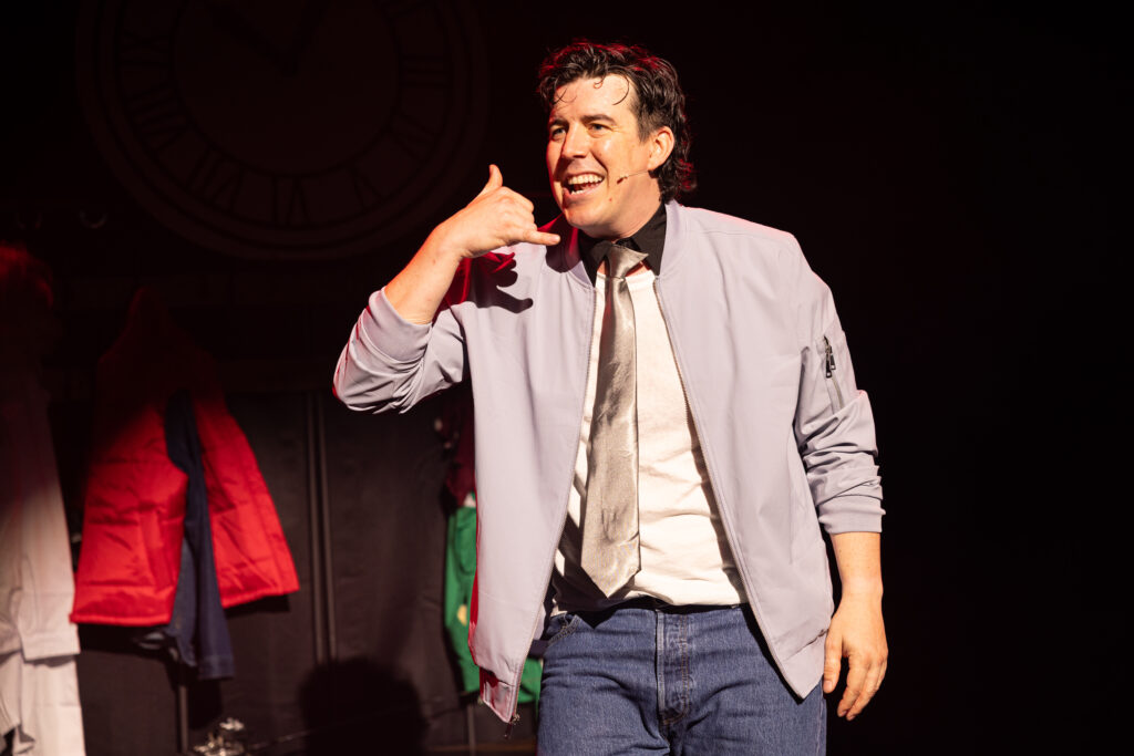 Biff to the Future is the story from the POV of the film’s bully, Biff Tannen. The Wilton’s audience are already onside. They know the film, know the characters, and have a good idea of the complex storyline that was played out over the three films in the series. So when Joseph dons a pair of glasses, changes his voice and mannerisms, we can see it is Marty McFly’s nerdy father. A white wig turns him into Doc Brown, a red puffer jacket and he becomes Marty McFly himself. The performer becomes just about every man, woman, and child – including a girl who only spoke 13 words – in that iconic trinity of movies!