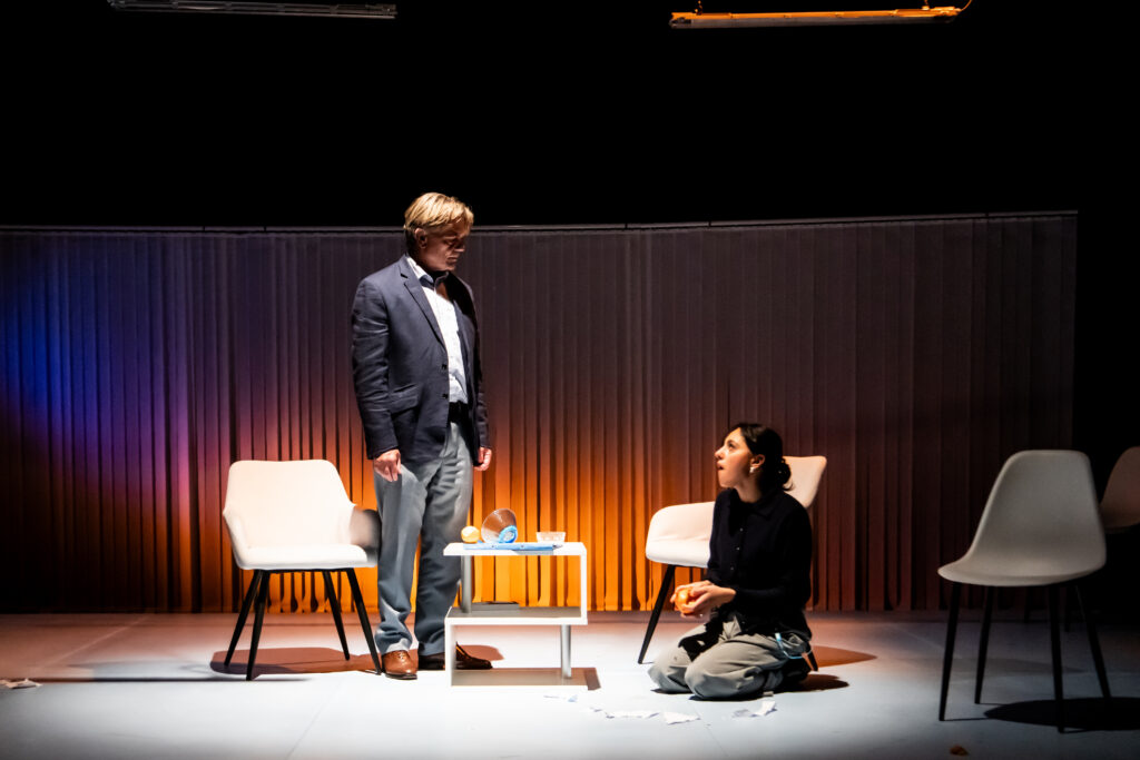 Joe Penhall’s play Blue/Orange takes place on a stylishly simple white set, designed by Jana Lakatos, which is furnished with white furniture, a water fountain and a coffee table with a bowl of oranges upon it, writes Linda Emmanuel.