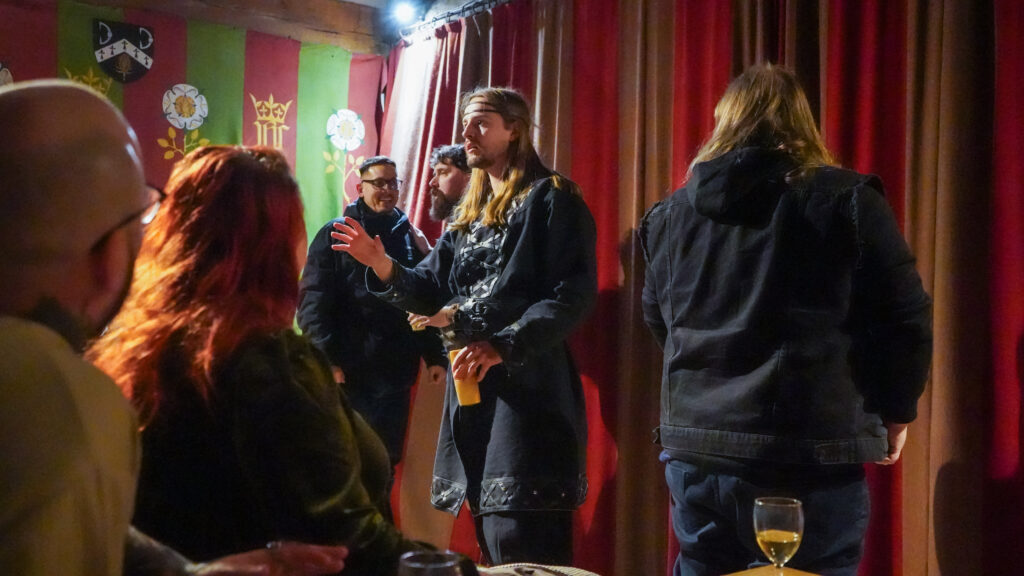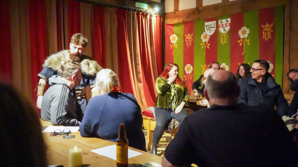 Between this pair of intrepid warriors they magic up fights to the death, heads being lopped off, ghosts from the past and visions of the future. This deadly duo – along with as many of the audience that they tempt into their world of war – begin with a slow and arduous row across the treacherous North Sea in a longboat I wouldn’t want to take out on a boating lake; someone is assigned as the Mead Carrier, as the Queen of Sweden, as a high up from Denmark; we all become Saxons losing the battle and then Vikings conquering all. As one we sang, we toasted heroes, we chanted and stamped our feet and became ghosts when instructed.