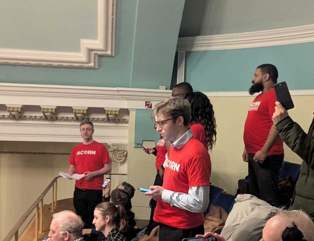 Members of the campaign group and community organisation Acorn interrupted the meeting within the first hour as they stood up in the public gallery and demanded “a fairer and more humane approach to council tax”.