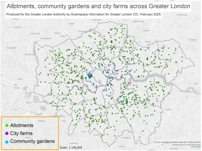 A map showing allotments, city farms and community gardens in the capital, included in the London Assembly environment committee’s latest report. Credit: Greenspace information for Greater London (GiGL)