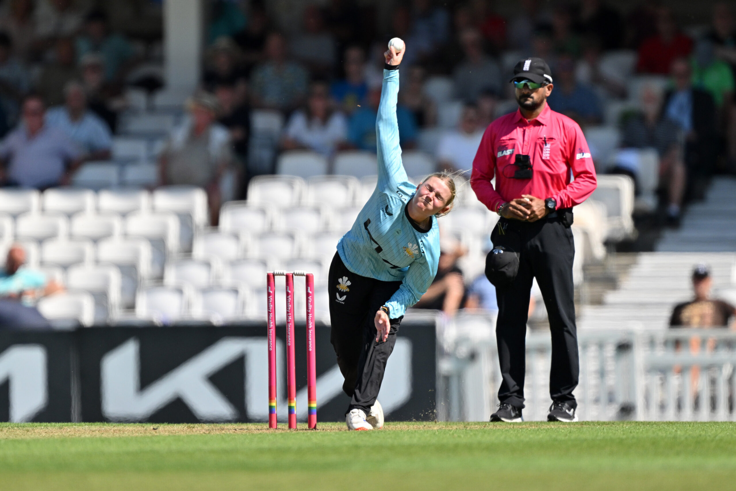 Danni Wyatt-Hodge, involved in the mix-up, was starved of strike and became fretful before dancing down the pitch to Morris to be stumped by Threlkeld to leave Surrey 50-4.